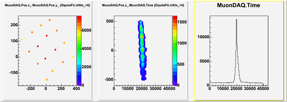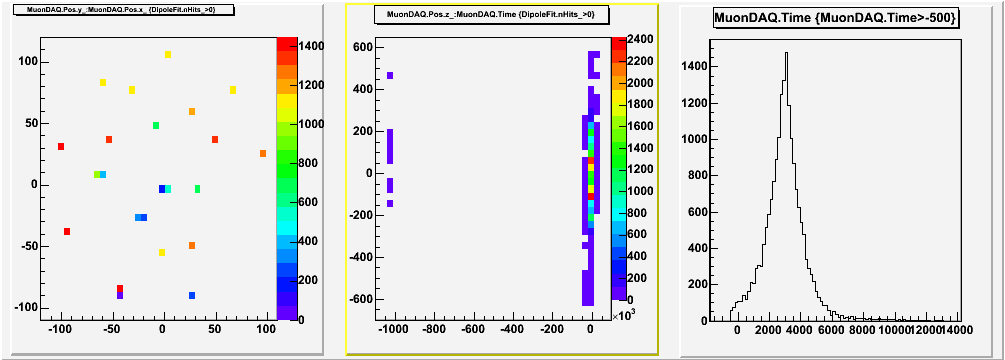 MuonDAQ times shown in the middle and the left plots suggests the "Minimum Time" and "Maximum Time" for this study.