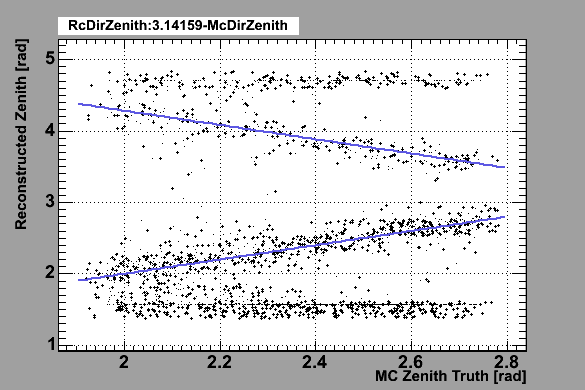 The points near the lower line are correctly reconstructed, the points near the upper lines are reconstructed with opposite cos(theta) signs for some reason.