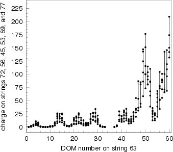 For the following analysis the sum of charges collected at the same DOM position on strings 64, 55, 54, 62, 70, and 71 was compared to a similar sum calculated with ppc simulation. Each of the charges is well below the saturation charge (of ~7500 at gain of 107) so no saturation correction was performed (which seems ok given the large dispersion of charges at each given DOM position on the 6 strings nearest to string 63).