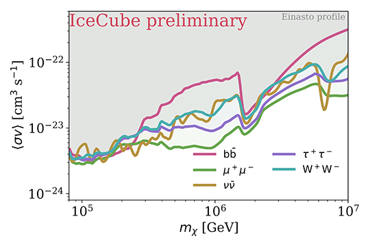 Comparison of the dark matter velocity averaged self-annihilation cross-section limits for a benchmark channel (χχ->μμ) between different experiments; previous IceCube MESE analysis [6], previous IceCube muon analysis [7], HAWC dwarf spheroidal analysis [8], MAGIC and FermiLAT combined analysis [9], VERITAS [5], ANTARES [10] and H.E.S.S. [11]. An Einasto halo profile following [0] is assumed.2