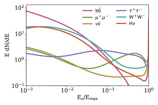 Simulated neutrino spectra in the dark matter rest-frame for all investigated annihilation/decay channels. Emax denotes the dark matter mass/half the dark matter mass for annihilation/decay respectively. At the high masses considered here, the shape of the spectra is, up to a scaling factor, identical for all masses.