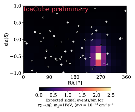 The colour map shows the expected neutrino signal events in each analysis bin for a dark matter annihilation model with: χχ->μμ, m=1PeV, <σv>=10^-23 cm^3/s. The white '+' and 'x' marks show the best fit directions of HESE (double) cascade and track events respectively. HESE events below 60TeV are not shown as they are not considered in this analysis. An Einasto halo profile following [19] is assumed.