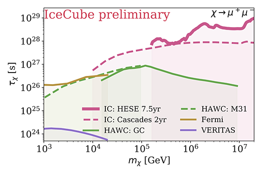 Comparison of the dark matter lifetime limits for a benchmark channel (χ->μμ) between different experiments; previous IceCube analysis [20], HAWC Galactic Centre analysis [21], HAWC M31 analysis [22], FermiLAT [23] and VERITAS [24]. An Einasto halo profile following [19] is assumed.