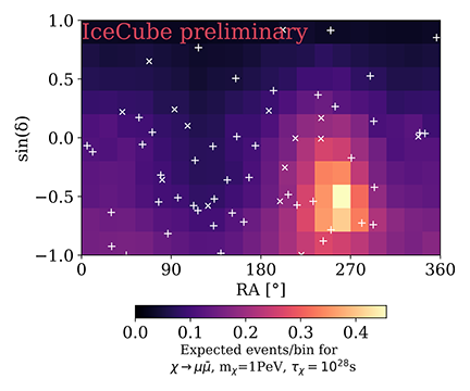 The colour map shows the expected neutrino signal events in each analysis bin for a dark matter decay model with: χ->μμ, m=1PeV, τ=10^28s. The white '+' and 'x' marks show the best fit directions of HESE (double) cascade and track events respectively. HESE events below 60TeV are not shown as they are not considered in this analysis. An Einasto halo profile following [0] is assumed.