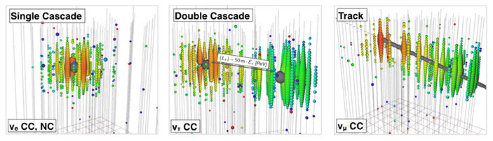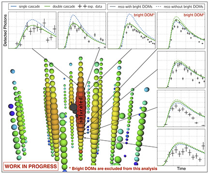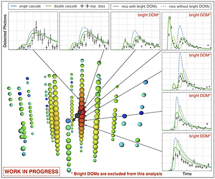 Double cascade events: Event#2 (2014). The reconstructed double cascade positions are indicated as grey circles, the direction indicated with a grey arrow. The size of the circles illustrates the relative deposited energy of the two cascades.