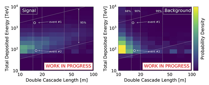 Double cascade observables histograms showing total deposited energy against reconstructed length for the double cascade sample. Signal nu-tau-induced double cascade events) histogram (left). Background (all remaining events) histogram (right). The two tau-neutrino candidate events are overlaid as white circles (see below).