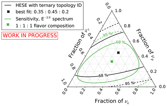Measured flavor composition of IceCube HESE events with ternary topologyID and sensitivity at the best fit spectrum. Contours obtained using Wilks' theorem.