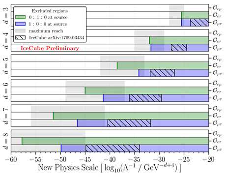 Exclusion limits obtained for the scale of New Physics (horizontal axis) for dimension-three to dimension-eight SME coefficients at IceCube. Limits are obtained for each dimension (left vertical axis) corresponding to different assumptions on flavour content at the production and also on the dominant New Physics mixing scenarios (right vertical axis). Green and blue shaded regions are excluded with a very strong strength-of-evidence (\mathcal{B} > 10^{1.5}) according to Jeffreys' scale. The grey shaded regions show the maximum reach of obtaining a limit. The hashed region shows the previous IceCube limit.
