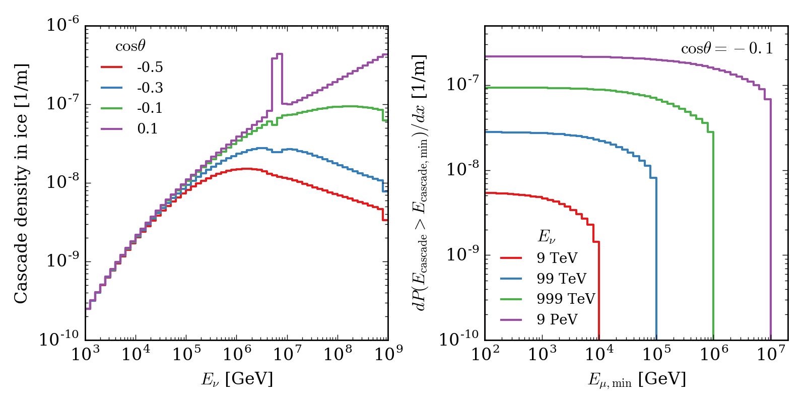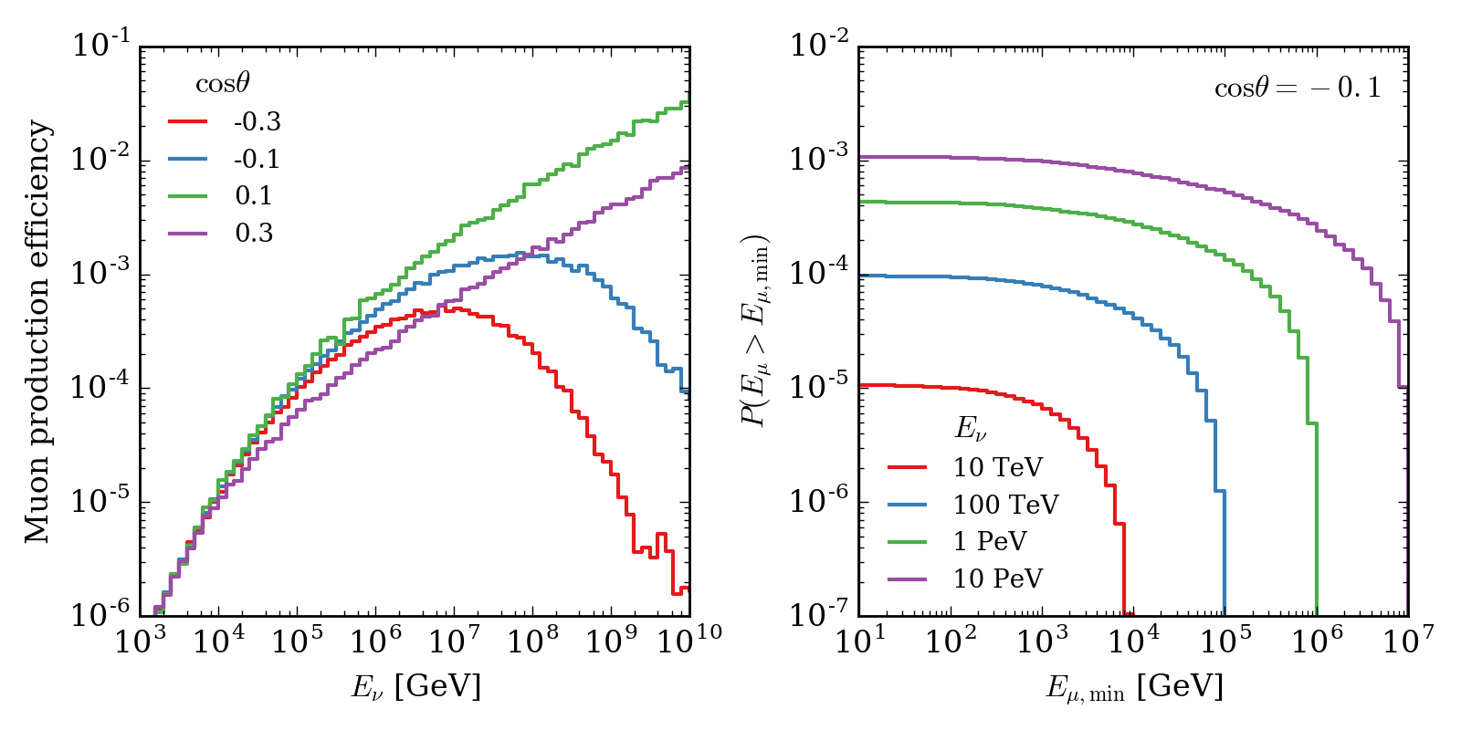 The left panel of the figure below shows the muon production efficiency at several zenith angles, averaged over neutrinos and antineutrinos and integrated over all muon energies greater than zero. The right panel shows the cumulative distribution of muon energies in several neutrino energy bins at a single zenith angle. These are the elements of a transfer matrix that converts neutrino fluxes into detectable muon fluxes.