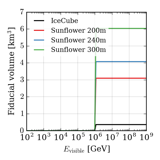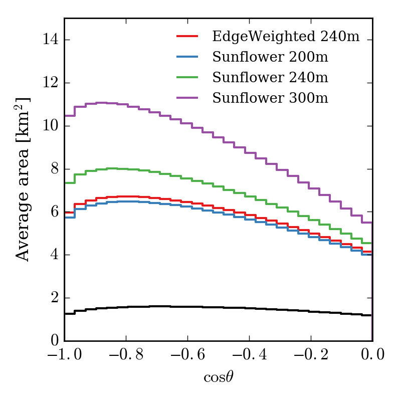 The figure below shows the area of several geometries averaged over a zenith band. The fiducial area of IceCube is given in black for comparison.