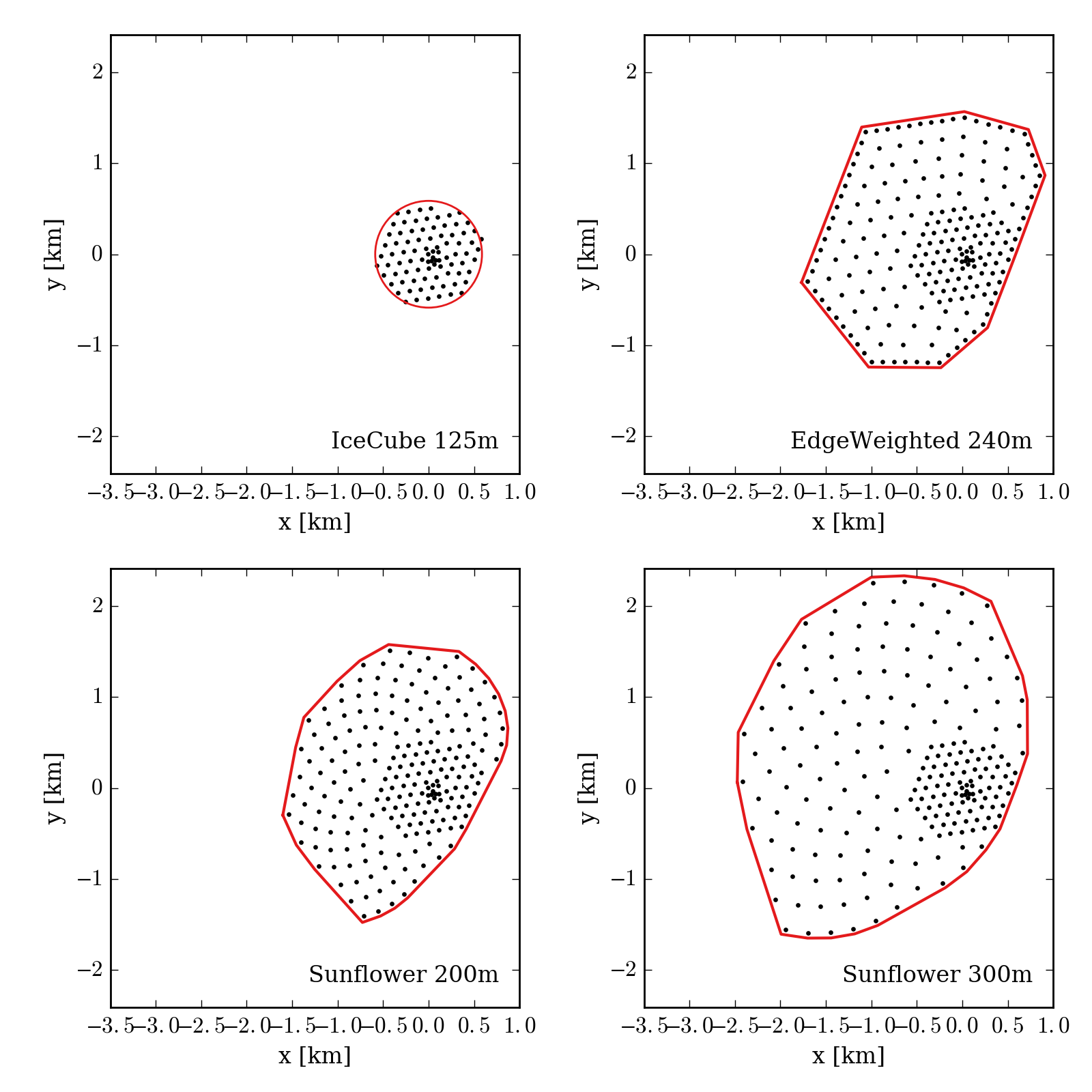 Now we need to take the geometry of the detector into account to convert the dimensionless muon production efficiency into an effective area for each proposed detector configuration. For each detector, we define a fiducial surface; muons that cross this surface should be detectable. The figure below shows the positions of the strings in a few detector configurations as black dots and the outline of the fiducial surface as a red line. The fiducial surface for IceCube is a cylinder with a size chosen in the muon effective area calculation for the Aachen multi-year diffuse analysis, while the fiducial surface for the Gen2 geometries is the convex hull of the strings, with each face moved outward by 60 m.
