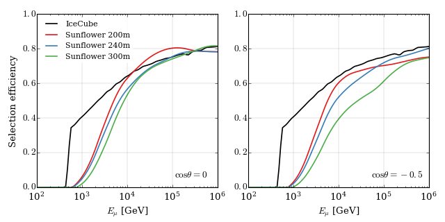 The selection efficiency is defined as the ratio of the muon effective area to the geometric area, which can be obtained easily from MuonGun simulation.