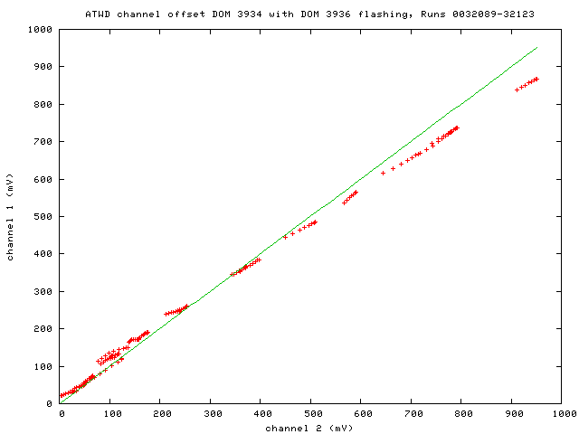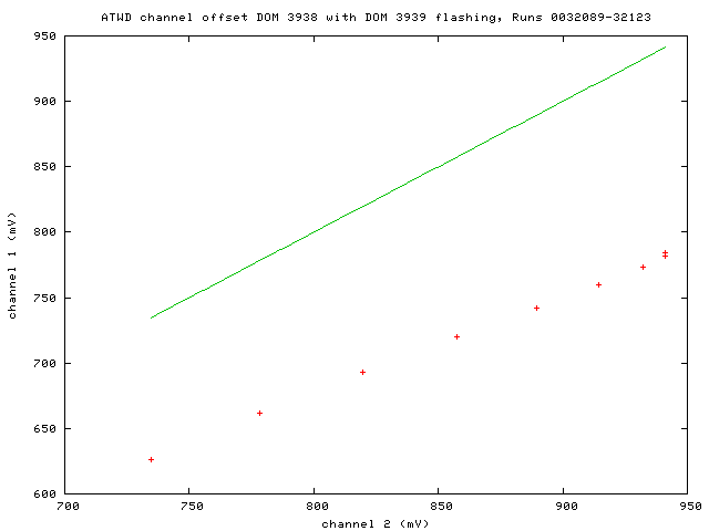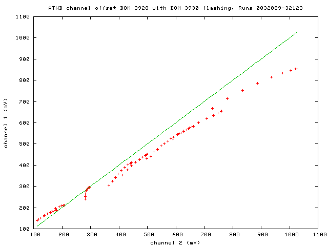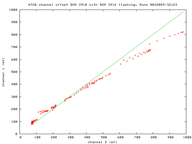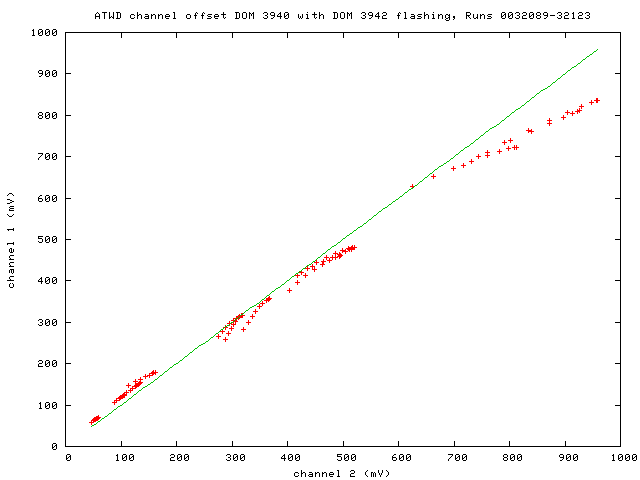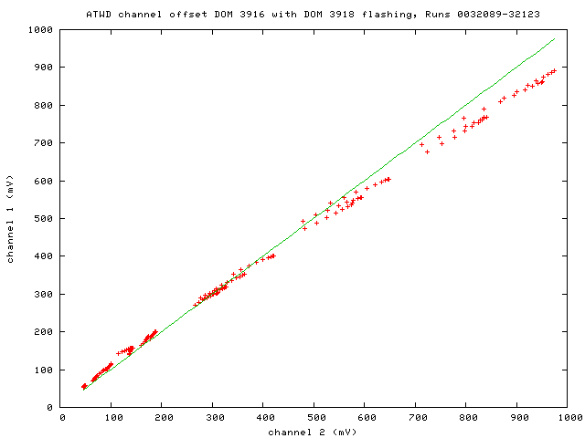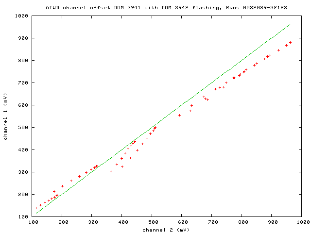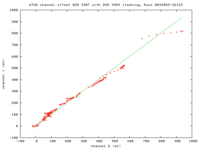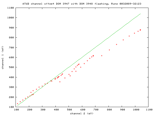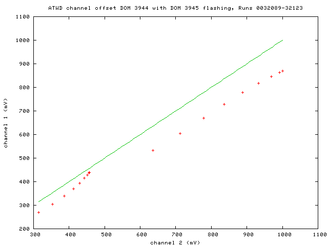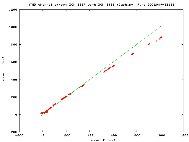 These plots depict the voltages measured in ATWD1 vs ATWD2 for DOMs on string 39. The data used were