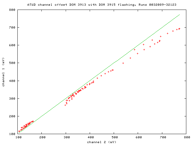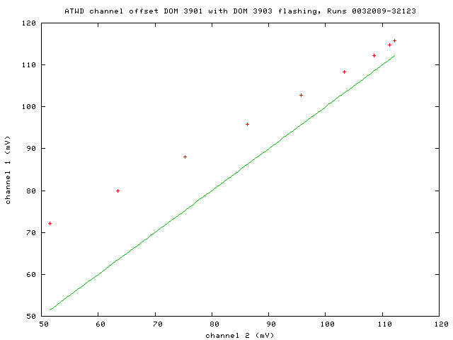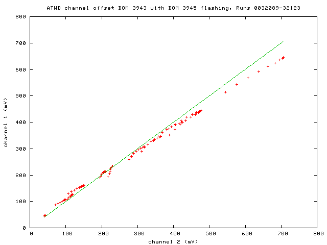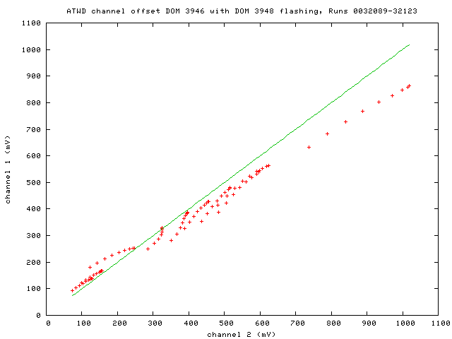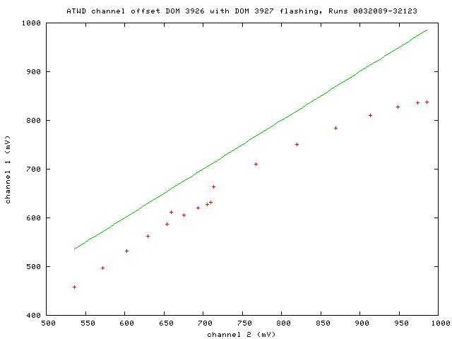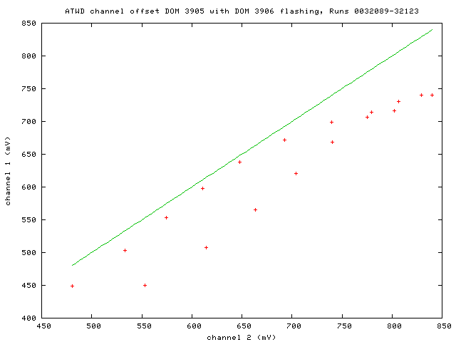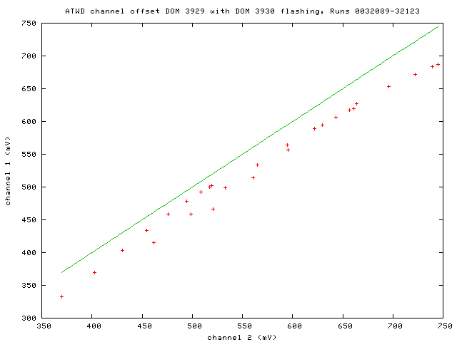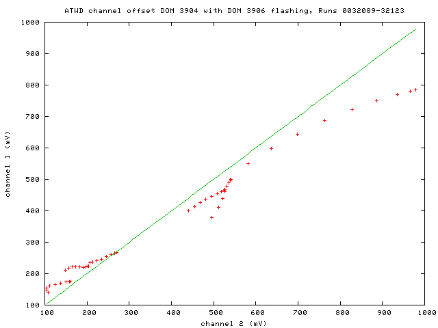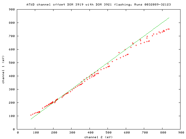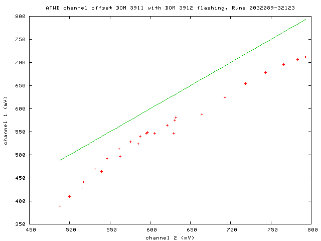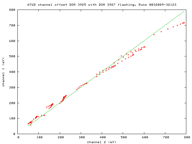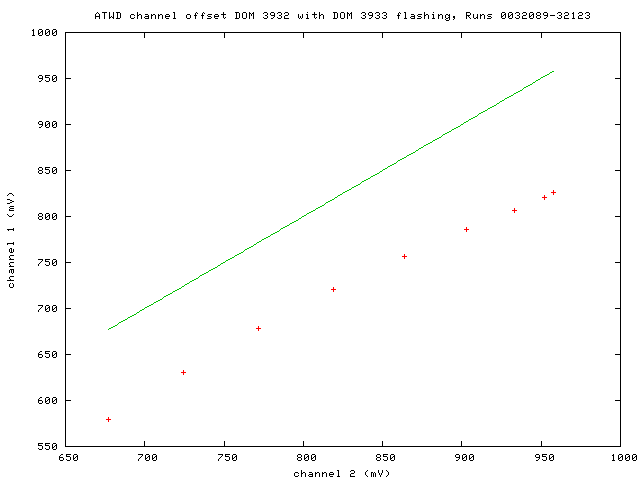 These plots depict the voltages measured in ATWD1 vs ATWD2 for DOMs on string 39. The data used were