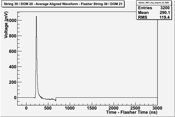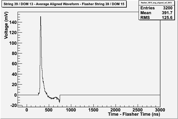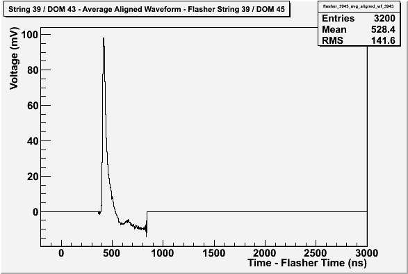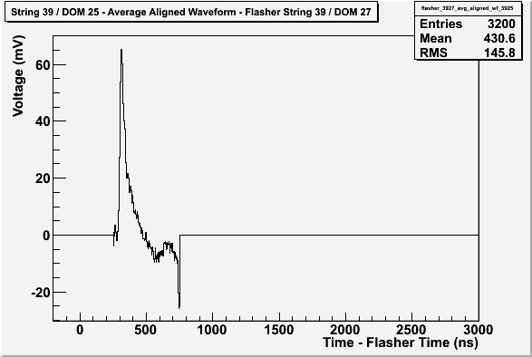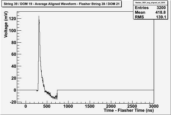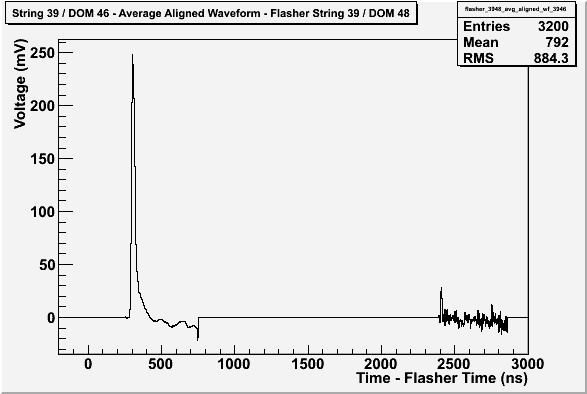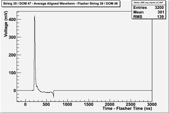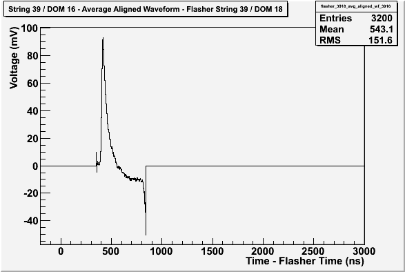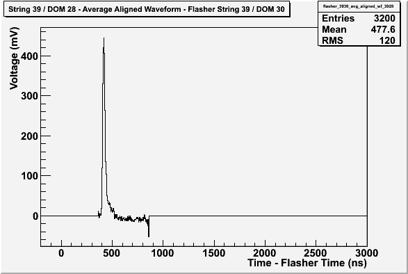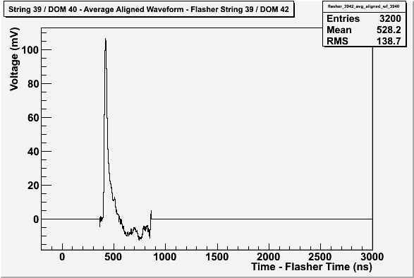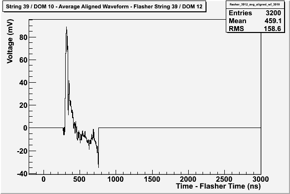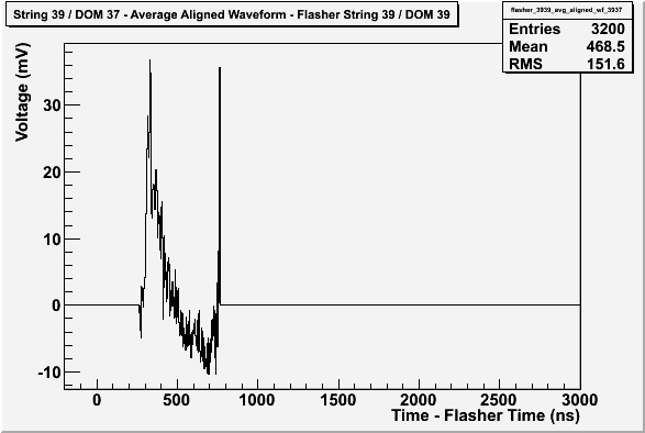 These are the waveforms from two runs from December 06. The waveforms are for bright 0 and width 50, run0032089, and each set consists of two waveforms corresponding to receiving DOMS: second DOM above the flasher, the DOM just above the flasher. DOMS 35-43, roughly, are located in the dust layers. Only DOM 37 receiving shows effects that are possibly due to the dust layers.