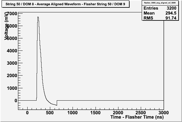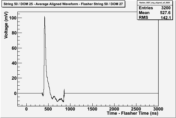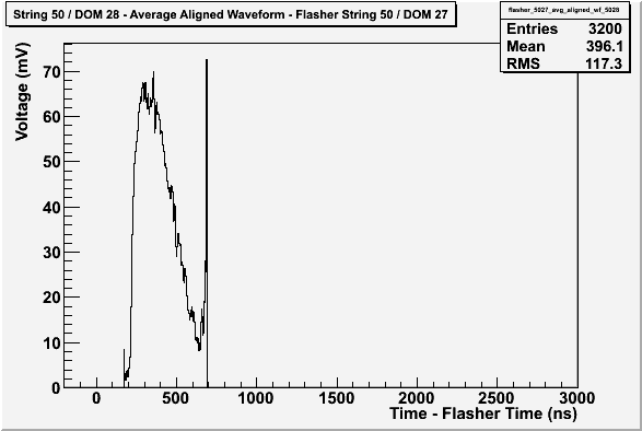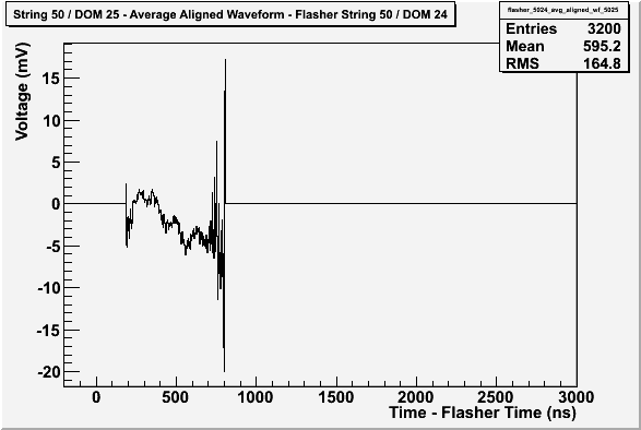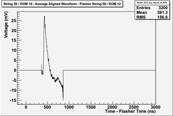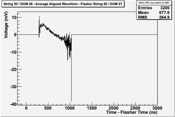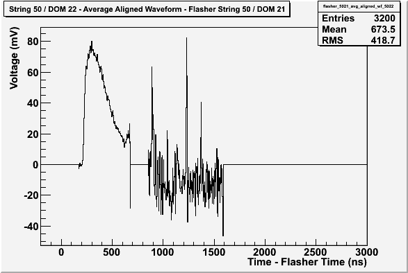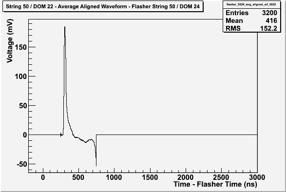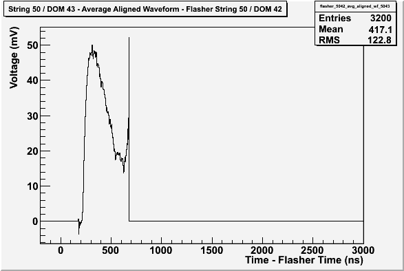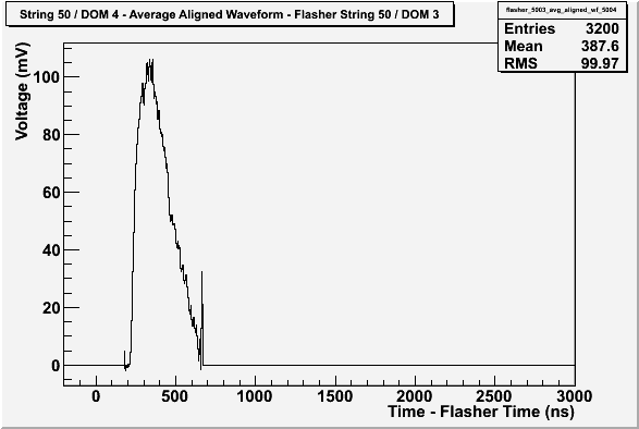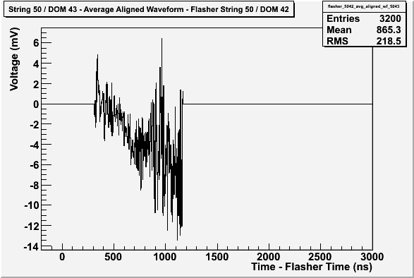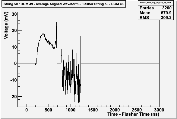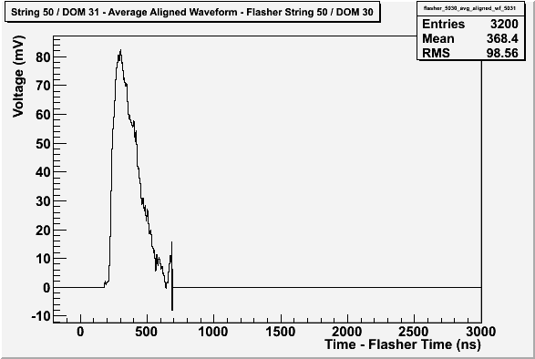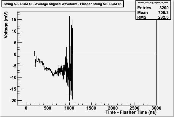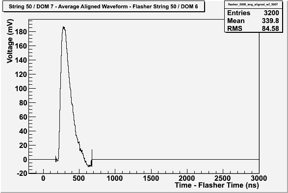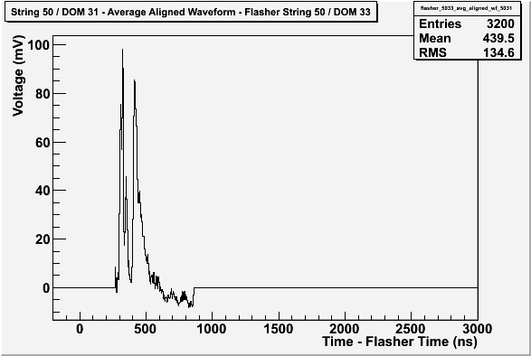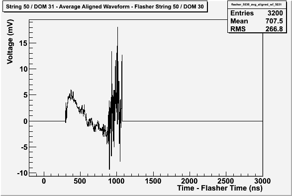 These are the waveforms from two runs from December 06. The waveforms are for two different brightness and each set consists of three waveforms corresponding to receiving DOMS: second DOM above the flasher, the DOM just above the flasher and the DOM below the flashing DOM. DOMS 35-43, roughly, are located in the dust layers. DOMs 31 and 32 receiving show double peaks.