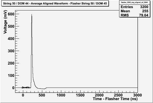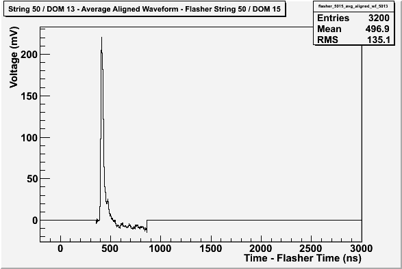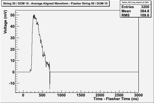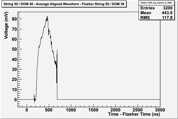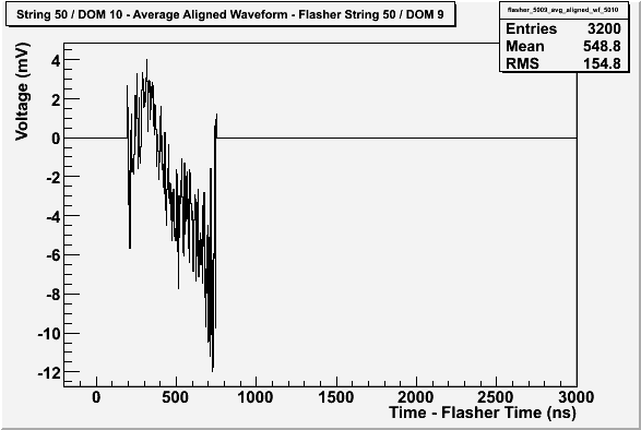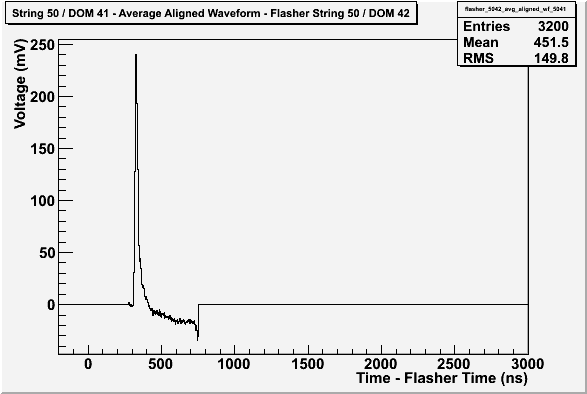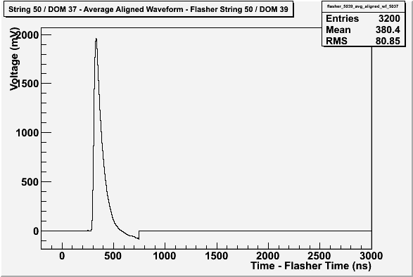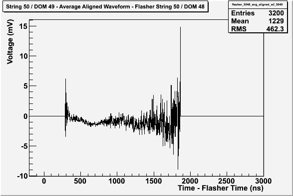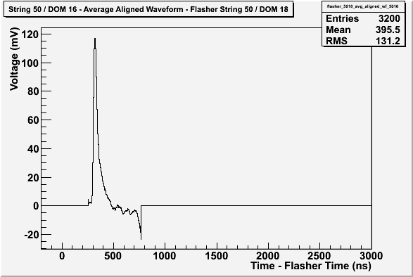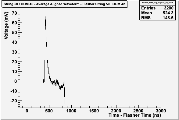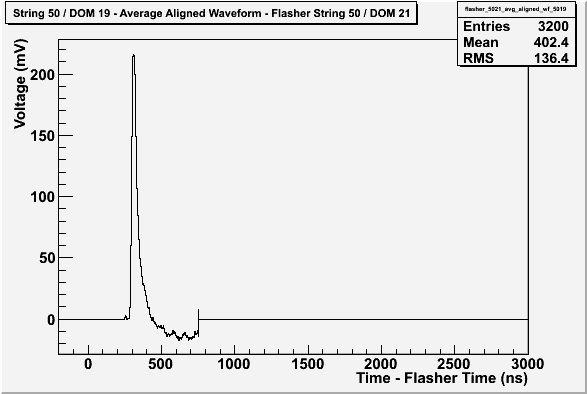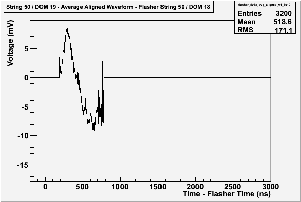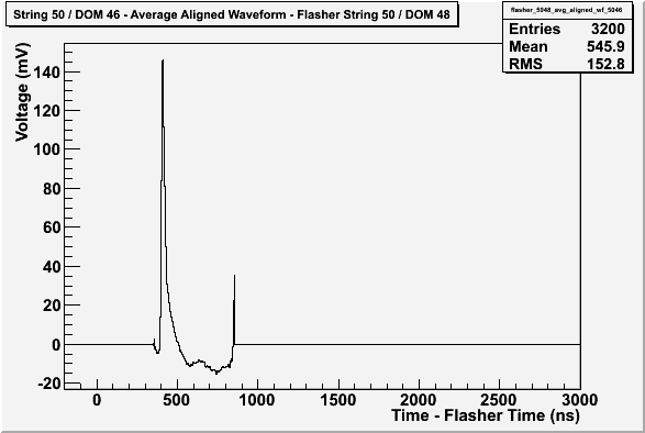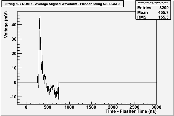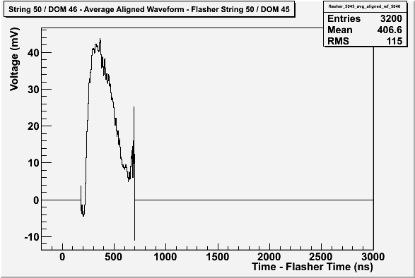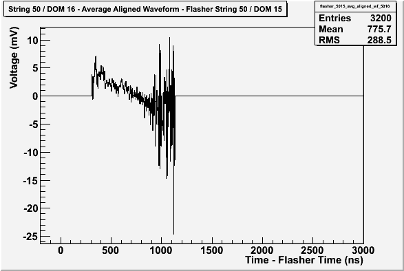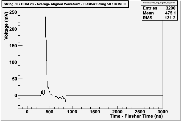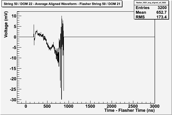 These are the waveforms from two runs from December 06. The waveforms are for two different brightness and each set consists of three waveforms corresponding to receiving DOMS: second DOM above the flasher, the DOM just above the flasher and the DOM below the flashing DOM. DOMS 35-43, roughly, are located in the dust layers. DOMs 31 and 32 receiving show double peaks.